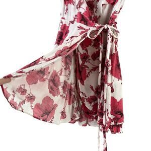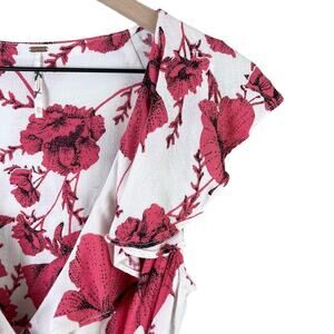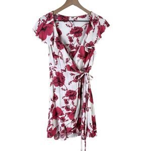 Features: Surplice V neckline, short flutter sleeves, true wrap style, tie waist, mini hem. Color: white with pink floral print.