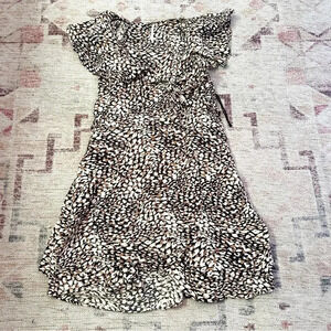 Pretty and femme, this printed wrap dress features ruffle details along the neckline and a tie at the waist.