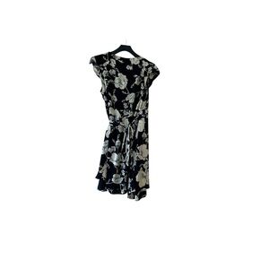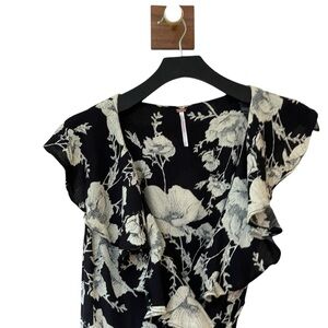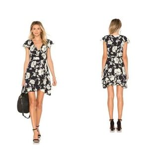 Free People French Quarter Wrap Mini Dress in Onyx Combo. Floral print wrap mini dress. Pretty and femme, this printed wrap dress features ruffle details along the neckline and a tie at the waist. Great pre-owned condition.