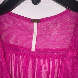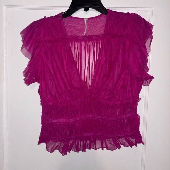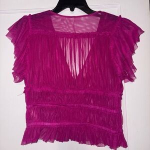 Stylish sheer blouse with ruffle details. Vibrant pink color. Perfect for casual or dressy occasions.