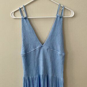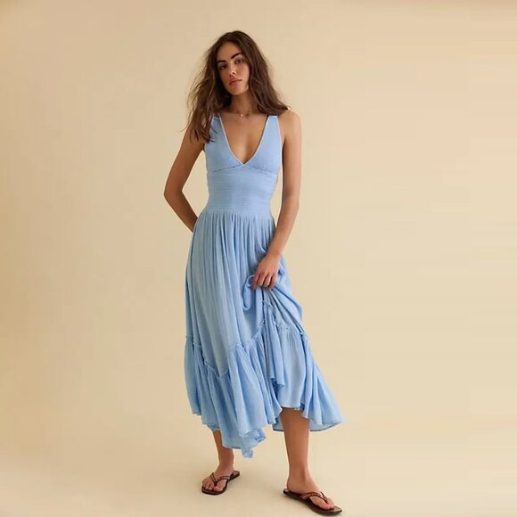 Billowy and breezy, this drop-waist maxi dress from free-est features a hugging smocked bodice with a flowy tiered-hem skirt for the perfect frolick-ready piece.