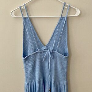 Features: Airy gauze fabrication, V-neckline, smocked bust and bodice, flowy gathered skirt, tiered hem, double-strap design with adjustable tie at back