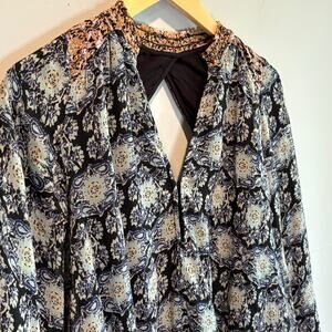 Trapeze silhouette flowing tunic. Floral print. Dramatic bell sleeves and tiered ruffle hems. Notch neckline with hook and eye closures. Pullover styling. Open back with tie detail.