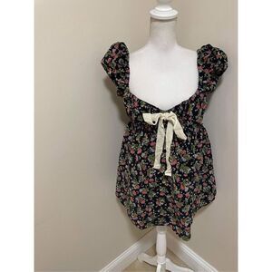 Features: Sweetheart neckline, slightly puffed sleeves, velvet tie detail, pleating at bust, smocking at back