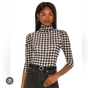 Free People Gather Gingham Mesh Turtleneck Small Black and White Puff Sleeve
