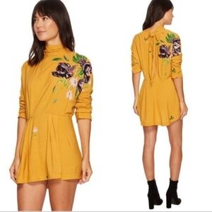 New with tags! Free People Gemma mini tunic dress in mustard with floral details. Femme floral tunic featuring a high neckline with an open back design and cute tie detail. Fitted at the waist. Can be a top or super mini dress.