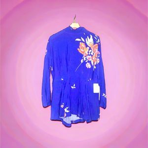 Romantic floral tunic featuring high neckline with an open back design and cute tie detail, semi sheer (not transparent at all) fabric and a fitted waist.