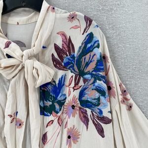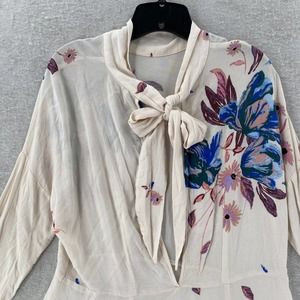 This Free People Gemma Tunic Mini Dress in Ivory with a floral pattern is perfect for a casual occasion. The dress features a mock neck with a tie closure and dolman sleeves. It has a keyhole neck and an open back, which adds a touch of elegance. The dress is made from rayon fabric, which is perfect for summer, fall, and spring. The tunic dress has a boho and flower theme and is available in size L.