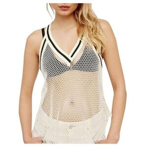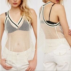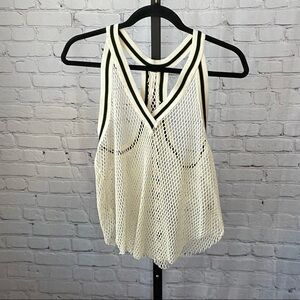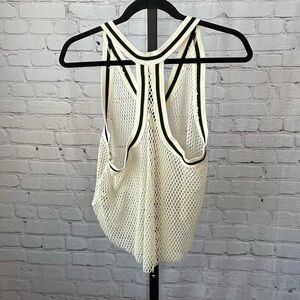 Swingy mesh tank with a contrast ribbed, athletic-inspired striped neckline. Unfinished edges for a lived-in look.