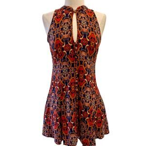 Free People Get Together bohemian printed multicolor Tunic Top/ Mini Dress in size 6 in Excellent pre owned mint condition, no stains, holes or tears. Sleeveless, fit and flare with keyhole neckline & single button mandarin collar. Covered button closures down front of dress. The dress features a beautiful bohemian pattern of rusty red, earthy orange, peach and mauve on a navy blue background. Rich colors that will fit any season, whether it's summer, fall, or spring. The dress is made of high-quality Rayon material, which ensures comfort and drapes beautifully over the figure. This design is typical of the Free People brand, known for producing unique and stylish clothing for women.
