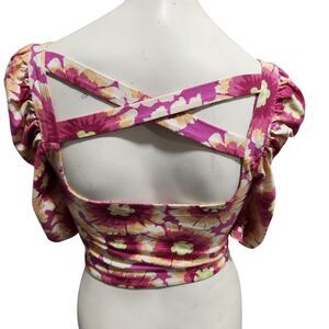 Style: Cropped open criss-cross back with puffed sleeves floral allover print