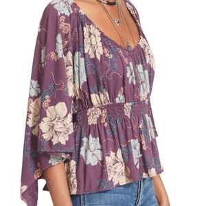Free People Glenside Purple Floral Bohemian Peasant Flutter Sleeve Peplum Top