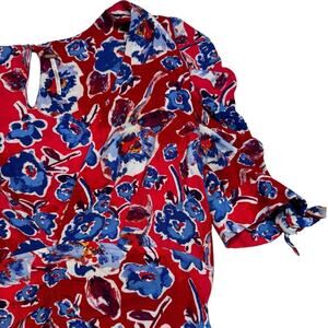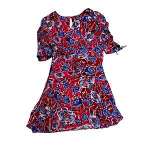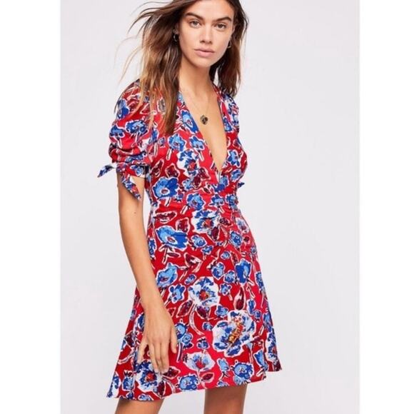 Free People "Glow Up" mini dress. Red with blue floral throughout. Ties at sleeves. Button closure at back of neck. Deep V Neck Front with NO closure. Size 6. Lined. 100% rayon.