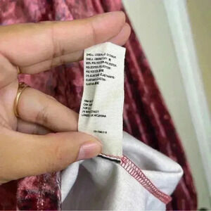 Wine color with subtle all over print. Machine wash
