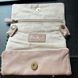 Free People blushy-cream goat leather crossbody bag; textile interior with multi functional compartments and pockets; unique brass tone detachable beaded strap; tap snap closure