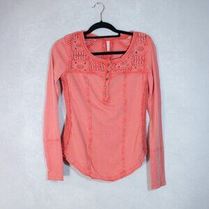 Free People Gold Coast Henley Top Lace Buttoned Blouse Washed Red Coral Size SP