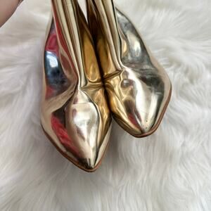 Super cute pair of metallic patent faux ankle leather boots from Free People. They have some scuffing and the clear heel is a little foggy but still have plenty of life left! Super fun for a groovy night out. Price reflects condition.