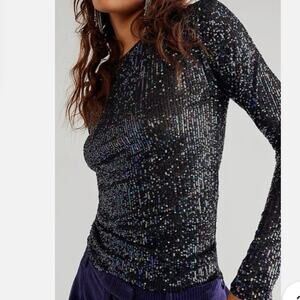 Elevate your wardrobe with this stunning Free People Gold Rush Long Sleeve Top. The top features a solid pattern, round neckline, and classic/fitted sleeves with accents of sequins that add a touch of glamour. The pullover closure and slim fit make it perfect for any party/cocktail occasion.