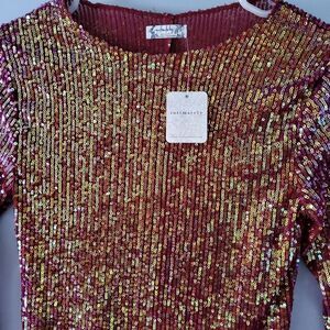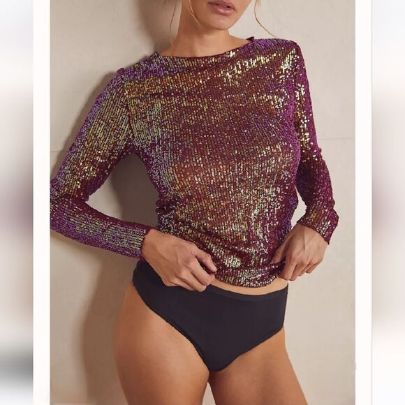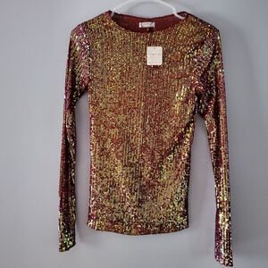 Steal the show in this in figure-skimming top covered in lustrous sequins. This long sleeve is absolutely stunning with a champagne gold embellishment all over. Pair with boyfriend jeans an strappy heels for a night out look!