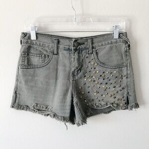 Free People Golden Hippie Studded Cutoff Shorts in gray. Size 24. Denim. 5-pocket shorts. Frayed hems. Zipper and button fly closure. Factory distressing. 100% cotton. Machine washable. Midrise. Festival season. Retailed for $98. Pre-owned, excellent used condition.