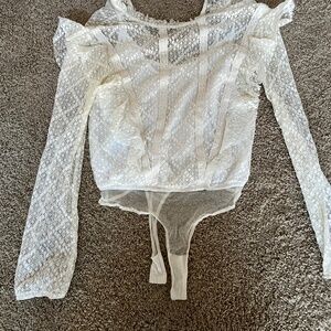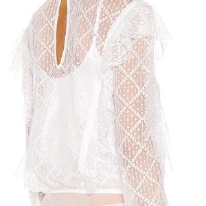 A high collar and frilly ruffles bring the trending prairie aesthetic to this thong-back bodysuit modernized in sheer lace with a convenient attached-cami lining.