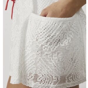 From Free People so made for your next tennis match, this feminine skort is featured in a high rise fit and breezy mesh fabrication with built in shorts and an adjustable waistband. Relaxed fit, mini length. Embroidered mesh, quick drying fabrication with four way stretch and phone pockets at legs, smocked elastic waistband in a water resistant fabrication. Fabric 94% polyester 6% elastane. Measurements waist flat unstretched 13" rise 9.5" inseam 3" length 12.25"