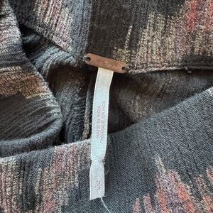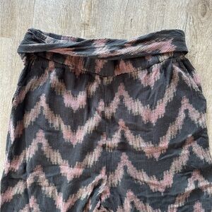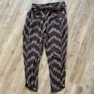 Belted waist. Zipper ankle with angled hem. Chevron pattern.