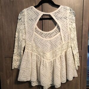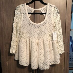 Brand New Boho FP Brushed Lace Peplum Empire Waist Flared Top. Ivory Color 3/4 Sleeve and Cut Out Back. Polyester/Spandex Fabric.