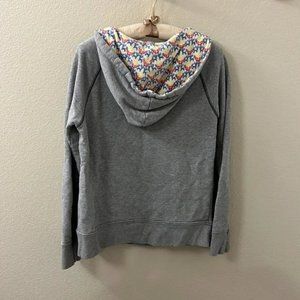 Super-cute hoodie with fun, colorful detailing. Cute pattern with blue reindeer, red flowers and yellow +purple accents.