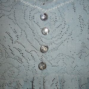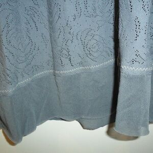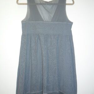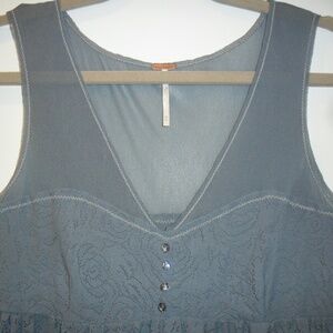 This is a wonderful Dress By Free People. It just slips on overhead and can be worn in multiple ways. The mesh upper part of the dress together with the lacey looking sheer fabric of the dress gives it a very light and breezy look. Add the finishing touches of rhinestoned buttons and accent stitching throughout and you have a wonderful dress. Wear it as a sheath over a tank and jeans or with a slip as a beautiful delicate dress.