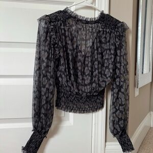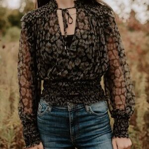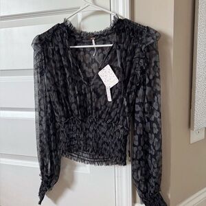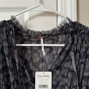 This stylish blouse from Free People features a smocked and ruffled design in a chic gray and black color palette.