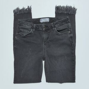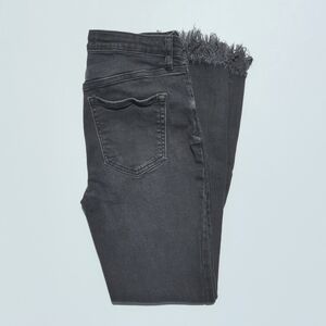 These super cute and classic jeans feature a mid rise and a skinny fit. They have distressing down the front with a frayed raw hem that is ankle cropped. They button and zip to close with belt loops and double pockets on the front and back. They have a faded black wash. Extremely stylish, flattering and easy to style! Pair with graphic tees and sneakers for go to look! Perfect for wear year round! High quality denim!