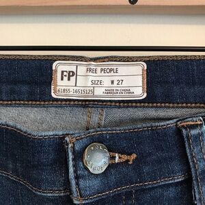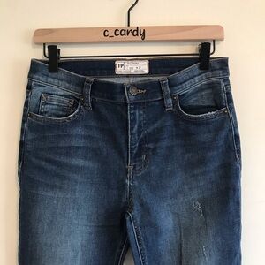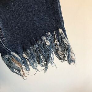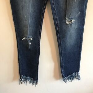Features: Dark wash blue skinny jeans, raw frayed hem, high rise skinny, light distressing, great heights style
