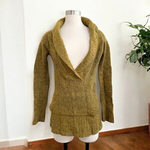 Free people long sleeve flared bell sleeve knit space dye, V-neck scoop neck tunic kangaroo pocket sweater. Unique olive green/brown color.