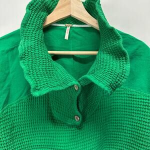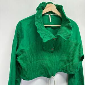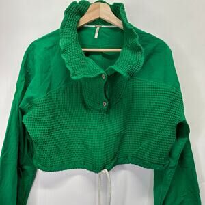 Free People Green Cropped Waffle Knit Quarter Button Sweatshirt Womens Medium