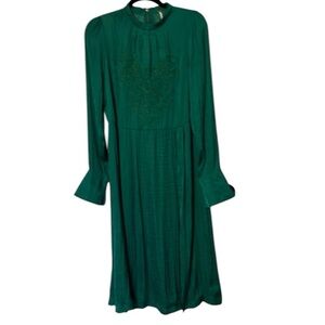 Modest neckline and sleeves with embroidery on the bodice. . Jewel toned green.