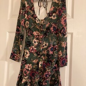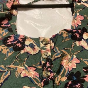 Free People Green Floral Dress Long Sleeve Square Neck Button Front Mini