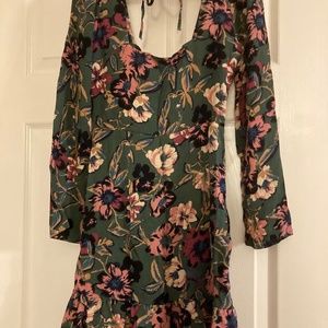 Free People Long Sleeve Square Neck Floral Mini Dress -Size: Unknown (missing size tag, please see measurements in pictures and description below) -I would guess the size is a 0/XS based on the measurements of other dresses for sale -Color: Green with pink, cream, and blue floral -Square neckline with tie in the back -Buttons down the front -Ruffle bottom hem -60% Viscose, 40% Rayon -Excellent pre-owned condition - No Flaws -Smoke free home Measurements taken laid flat and are approximate: Shoulder: 14" Pit to Pit: 14" Waist: 11" Length: 31" Sleeve: 21" Create a Bundle for discounted prices. Offers always welcome!