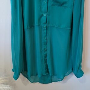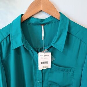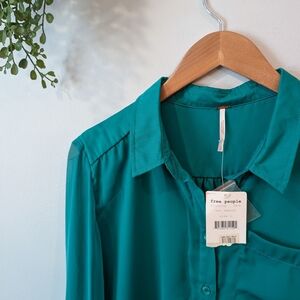 This NWT stylish button-down shirt from Free People showcases a classic dress shirt collar and a relaxed fit, perfect for any occasion. Crafted from a lightweight fabric, it offers a luxurious drape and a vibrant emerald green color that stands out. Ideal for both casual and formal settings, this top is a versatile wardrobe staple. bottom half and sleeves are chiffon. the back splits down the middle. size large. perfect condition. measurements in photos.