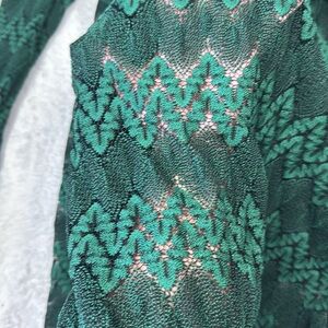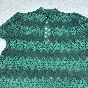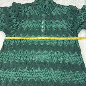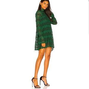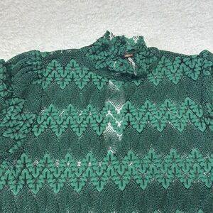 This stunning A-line dress by Free People features a rich green hue with elegant black detailing, perfect for a wedding guest or cocktail event. The long bishop sleeves and mock neck add a touch of sophistication, while the gentle flare of the silhouette ensures a flattering fit. Crafted for elegance, this dress is a timeless addition to any formal wardrobe. NOTE .IT IS A SHEER DRESS have to wear it with something underneath