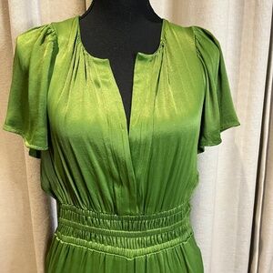 Chic Free People jumpsuit in a bold green satin finish. Features flutter sleeves, elastic waist for comfort, and wide leg design for a flattering, flowy look. Pre-loved condition, gently worn with no major flaws. Perfect for parties, special occasions, or a standout everyday style. Quick shipping and open to offers!