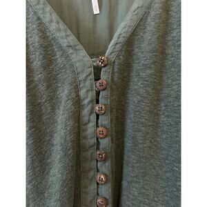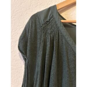 This Free People forest green top is a size M button-up with a V-neckline and pleated/smocked accents, perfect for a casual boho style. Made from a lightweight and breathable knit fabric blend of linen and viscose, it features short cap sleeves and a relaxed fit, ideal for summer, fall, and spring seasons. The top is designed with a solid green color and a bohemian theme, making it a versatile piece for any wardrobe. Hand wash only and not vintage, this top is a great addition for those embracing the fairy goth aesthetic. Please see measurement photo. Very good condition.