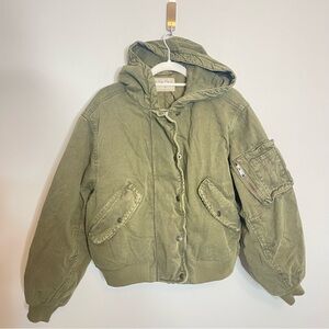 Inspired by true utility styles, this chunky bomber jacket from We The Free is featured in a sturdy canvas with ballooned drop-shoulder sleeves and an attached hood.