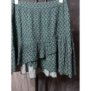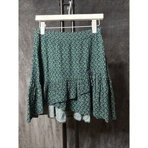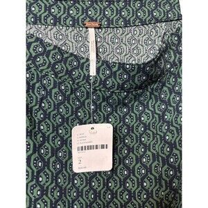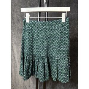 The product is a Free People Green and Blue Geometric Pattern Ruffle Skirt in size 2. This stylish mini skirt features a trendy geometric pattern and ruffle accents, perfect for adding a touch of flair to any wardrobe. The short length and regular fit make it a versatile piece that can be dressed up or down for any occasion. Made for women who appreciate both fashion and quality, this skirt is sure to become a go-to item for any trendy outfit.