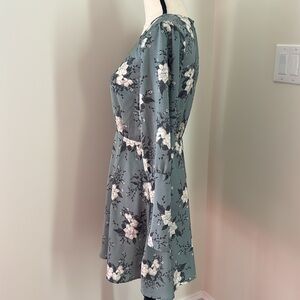 This dress has a side zipper and covered buttons in the back. It also has added detail with covered buttons on the sleeves.