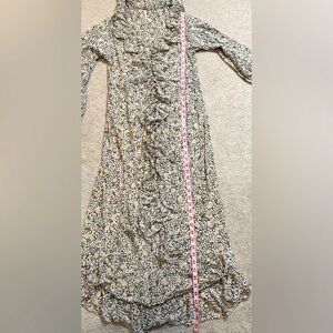 This stunning dress by Free People features a ruffled design in a vibrant green and white floral color palette. The dress has long bishop sleeves and a plunging neckline. Can be worn as dress with slip or Kimono Duster style.