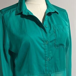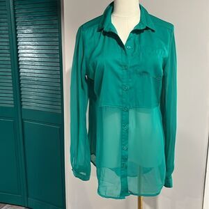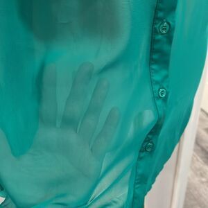 Elevate your style with this chic green sheer button-up blouse. Perfect for any occasion, this top offers a blend of elegance and comfort.