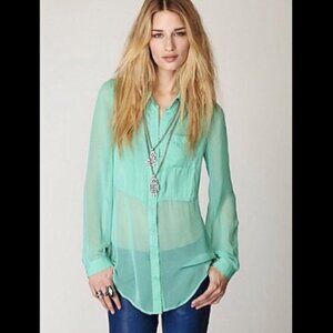 Free People Green Sheer Panels Long Sleeves Relaxed Fit Button-Up Blouse - S