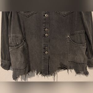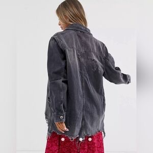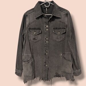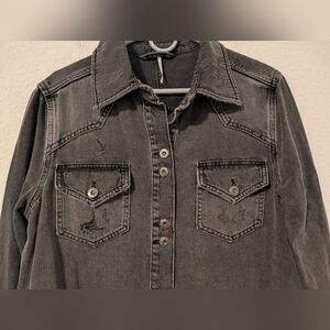 Free People Grey Denim Faded Distressed Longline Button-Up Moonchild Shirt Jacket Staple Punk Rock.
