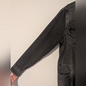 Size SM. True to size. Mid-weight. Soft and sturdy, comfortable denim. No stretch. Four front pockets. Buttoned cuffs. 100% cotton.